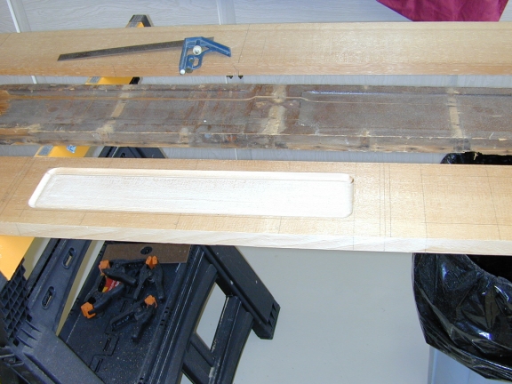 I used the original spar to layout the ribs and lightening pockets for the new spars. Each spar has 4 lightening holes per side, thus a total of 8 per spar. Each pair is a different size. A variable size jig was made to guide the router to the proper dimension. Just like when making the scarf joint, the lightening pockets were cut with many, many passes of the router, each taking off about 1/32” of wood. Around the edges of the pocket I used a rounded bit. At the bottom of this page is a picture of that same lightening pocket in a more “finished state”. This is where the gas tank is located.